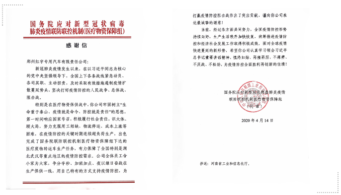 豫西集團鄭州紅宇專汽公司收到國務院應對新型冠狀病毒肺炎疫情聯(lián)防聯(lián)控機制醫(yī)療物資保障組發(fā)來的感謝信