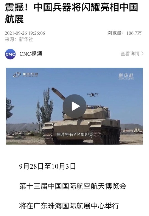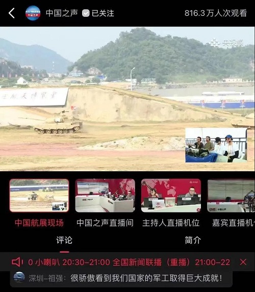 9月28日-10月3日,第十三屆中國國際航空航天博覽會在廣東珠海舉行,中國兵器工業(yè)集團(tuán)有限公司作為主辦單位閃耀亮相,推出裝甲突擊、火力打擊、智能彈藥、防空反導(dǎo)、無人裝備、非傳統(tǒng)安全、軍工軍技合作等領(lǐng)域新產(chǎn)品及成體系成建制武器系統(tǒng)和解決方案,全方位展示我國陸軍外貿(mào)武器裝備的最高水平以及雄厚的科技創(chuàng)新、自主研發(fā)與先進(jìn)制造能力,受到廣泛關(guān)注。 央視《新聞聯(lián)播》報道第十三屆中國航展,著重介紹了VT4主戰(zhàn)坦克,關(guān)注航展公眾日中國兵器館情況。9月28日下午央視《新聞直播間》航展特別節(jié)目《藍(lán)天盛會》邀請集團(tuán)公司訪談嘉賓做客直播間對中國兵器館兵器工業(yè)集團(tuán)展區(qū)等進(jìn)行1小時直播;9月28日下午、10月2日下午分別對地面裝備動態(tài)表演進(jìn)行兩場直播。央視《朝聞天下》、《新聞直播間》、《共同關(guān)注》、《天下財經(jīng)》、《軍事報道》、《正午國防軍事》、《軍武零距離》等相繼推出集團(tuán)公司參展裝備的報道。