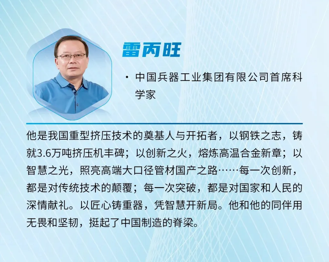 近日,《科學(xué)中國人》雜志社發(fā)布2024“年度科技人物”榜單,中國兵器首席科學(xué)家、北重集團(tuán)雷丙旺當(dāng)選“影響力科學(xué)家”。 雷丙旺是我國極端金屬擠壓技術(shù)的開拓者,扎根邊疆地區(qū)國防特大型企業(yè)工作38年,長期從事金屬成形制造裝備與工藝研究工作。他研制出我國極限制造的大國重器——3.6萬噸黑色金屬垂直擠壓機(jī),一舉打破國外技術(shù)封鎖,填補(bǔ)國內(nèi)空白,實現(xiàn)了超(超)臨界電站核心管道和航空發(fā)動機(jī)高壓渦輪盤粉末合金棒材的中國制造,開發(fā)出成套關(guān)鍵技術(shù),取得一系列原創(chuàng)性成果,促進(jìn)了產(chǎn)業(yè)的融合發(fā)展,創(chuàng)造巨大經(jīng)濟(jì)社會效益。